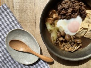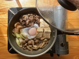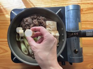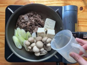 - フライパンの中に、豆腐・長ネギ・しめじを入れる。酒・砂糖を入れ、強火で沸騰させ、フタをして中火で3分加熱する。