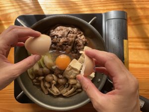- フライパンの真ん中に、たまごを割って入れ、中火で1から2分加熱する。